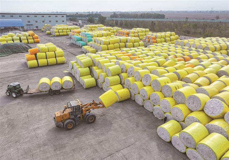 10月13日,瑪納斯縣銀田棉業(yè)有限公司樂土驛軋花廠,鏟車在擺放棉包。金秋十月,昌吉州近300萬畝棉田迎來豐收,陸續(xù)進入采收期,機械化收獲率達100%,預(yù)計總產(chǎn)突破145萬噸。目前,全州425臺采棉機已調(diào)配至各縣市、園區(qū),全力確保朵絮歸倉。