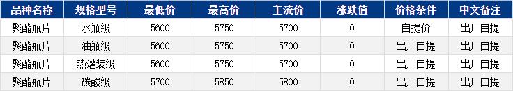 華東聚酯瓶片收于5700元/噸,漲跌值0元/噸,原料繼續(xù)上漲,然而聚酯瓶片僵持整理。10-11月貨源報(bào)盤5600-5750元/噸,實(shí)單遞盤零星。