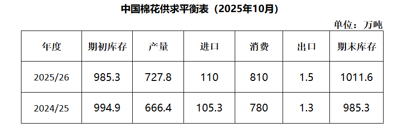 中國棉花協(xié)會預(yù)測:2025/26年度全國棉花產(chǎn)量727.8萬噸,較上期上調(diào)6.2萬噸,同比增長9.2%;棉花進(jìn)口量110萬噸,同比增長4.5%;消費量810萬噸,同比增長3.8%,期末庫存相應(yīng)升至1011.6萬噸,同比增長2.7%。