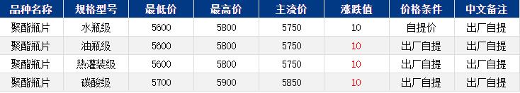 華東聚酯瓶片收于5750元/噸,漲跌值10元/噸,行業(yè)消息提振,原料繼續(xù)上揚(yáng),成本推動下,聚酯瓶片工廠報(bào)價(jià)多上調(diào)50元/噸,然而下游追漲謹(jǐn)慎,市場重心窄幅上行。10-11月貨源報(bào)盤5700-5800,局部略低5650,遞盤5700-5750。