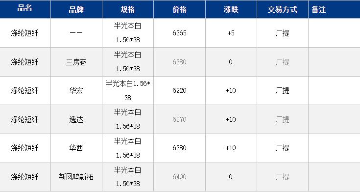 1.4D半光直紡滌綸短纖江浙商談重心6300-6500元/噸出廠或短送,福建主流商談6300-6500元/噸現(xiàn)款短送,山東、河北主流6350-6550元/噸送到。