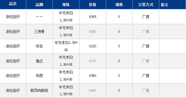1.4D半光直紡滌綸短纖江浙商談重心6250-6500元/噸出廠或短送,福建主流商談6300-6500元/噸現(xiàn)款短送,山東、河北主流6350-6550元/噸送到。