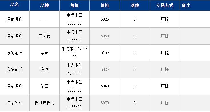 1.4D半光直紡滌綸短纖江浙商談重心6200-6450元/噸出廠或短送,福建主流商談6300-6450元/噸現(xiàn)款短送,山東、河北主流6300-6550元/噸送到。