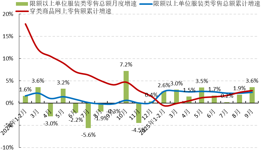 今年以來,在國家提振消費(fèi)政策發(fā)力顯效、居民消費(fèi)信心逐步回升等積極因素支撐下,服裝內(nèi)銷市場保持溫和增長,網(wǎng)絡(luò)零售渠道呈改善向好趨勢。據(jù)國家統(tǒng)計(jì)局?jǐn)?shù)據(jù),1-9月我國限額以上單位服裝商品零售額累計(jì)7590.2億元,同比增長2.4%,增速比2024年同期提升2.6個百分點(diǎn);直播帶貨、社交電商等業(yè)態(tài)模式持續(xù)激活消費(fèi),穿類商品網(wǎng)上零售額同比增長2.8%,增速比1-6月加快1.4個百分點(diǎn)。