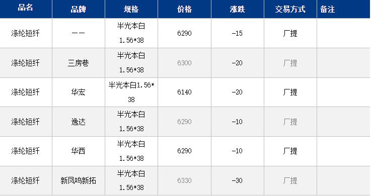 1.4D半光直紡滌綸短纖江浙商談重心6150-6400元/噸出廠或短送,福建主流商談6200-6400元/噸現(xiàn)款短送,山東、河北主流6250-6500元/噸送到。