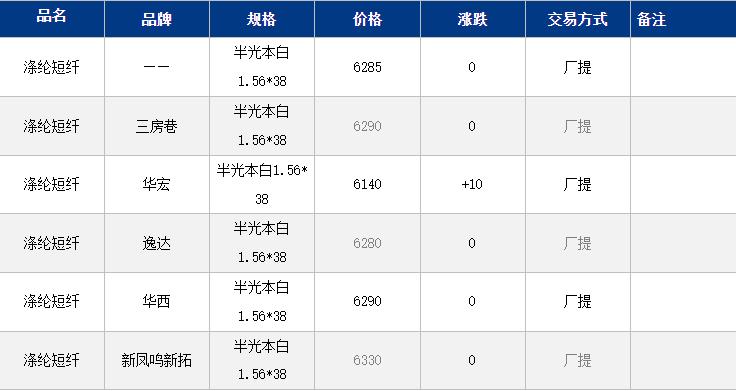 1.4D半光直紡滌綸短纖江浙商談重心6200-6400元/噸出廠或短送,福建主流商談6250-6400元/噸現(xiàn)款短送,山東、河北主流6300-6500元/噸送到。