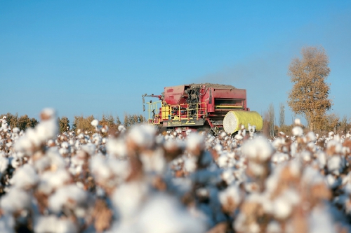 圖為新疆維吾爾自治區(qū)沙雅縣的棉田內(nèi),采棉機(jī)正在進(jìn)行機(jī)械化收棉作業(yè)。