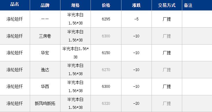 1.4D半光直紡滌綸短纖江浙商談重心6150-6450元/噸出廠或短送,福建主流商談6200-6400元/噸現(xiàn)款短送,山東、河北主流6250-6500元/噸送到。