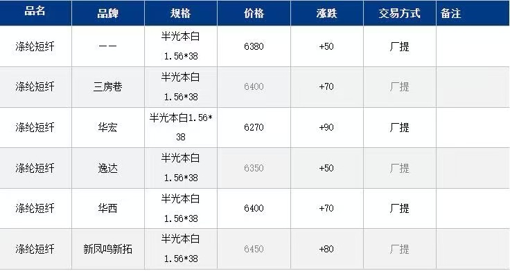 1.4D半光直紡滌綸短纖江浙商談重心6300-6550元/噸出廠或短送,福建主流商談6300-6500元/噸現(xiàn)款短送,山東、河北主流6400-6600元/噸送到。