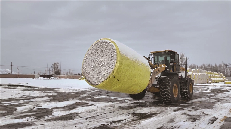 近日,在新疆宏祥棉業(yè)有限公司樂土驛軋花廠內(nèi),鏟車將棉花包運往加工車間。