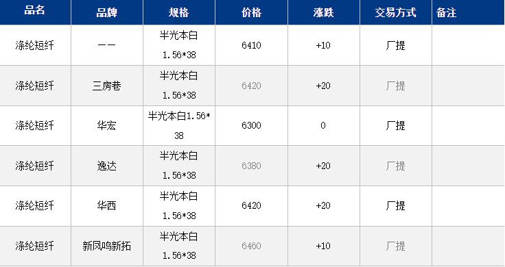 1.4D半光直紡滌綸短纖江浙商談重心6300-6550元/噸出廠或短送,福建主流商談6350-6550元/噸現(xiàn)款短送,山東、河北主流6400-6600元/噸送到。