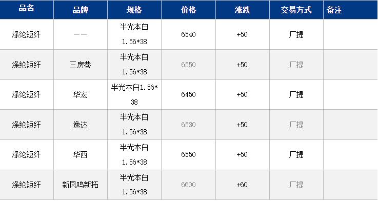 江蘇滌綸短纖現(xiàn)貨價(jià)格上漲50元到6540元/噸;成本繼續(xù)推動,短纖期現(xiàn)貨價(jià)格仍有上漲;目前江蘇主流6530-6600元/噸自提,偏低貨源6450元/噸附近。