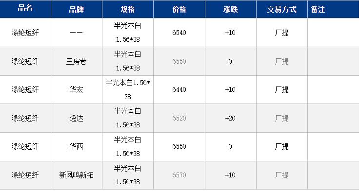 1.4D半光直紡滌綸短纖江浙商談重心6700-6750元/噸出廠或短送,福建主流商談6500-6700元/噸現(xiàn)款短送,山東、河北主流6600-6800元/噸送到。