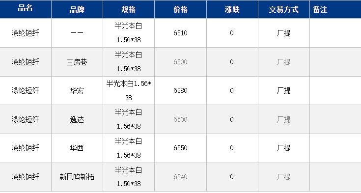1.4D半光直紡滌綸短纖江浙商談重心6400-6600元/噸出廠或短送,福建主流商談6450-6600元/噸現(xiàn)款短送,山東、河北主流6500-6700元/噸送到。