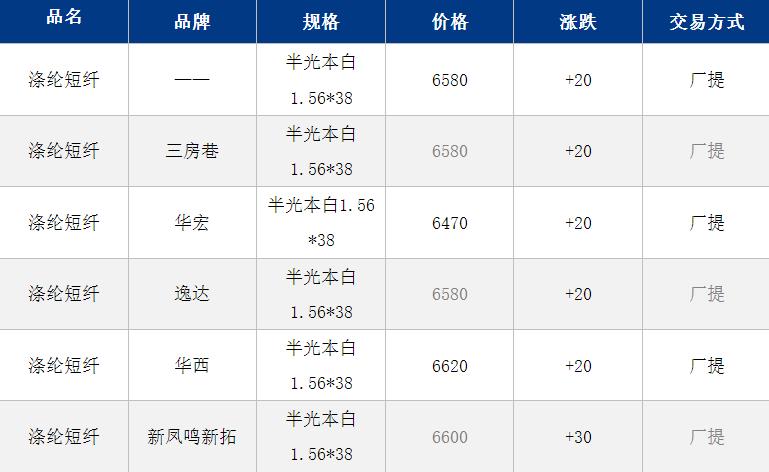 1.4D半光直紡滌綸短纖江浙商談重心6450-6700元/噸出廠或短送,福建主流商談6600-6750元/噸現(xiàn)款短送,山東、河北主流6600-6850元/噸送到。