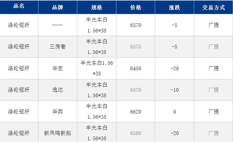 江蘇滌綸短纖現(xiàn)貨價(jià)格下跌5元在6570元/噸;早間江蘇主流商談6550-6600元/噸自提,偏低貨源6450元/噸附近。