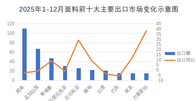 亞洲是我國面料出口主要市場(chǎng),2025年1-12月我國對(duì)亞洲國家出口面料460.3億美元,占面料出口總額的66.6%。在前十大目標(biāo)市場(chǎng)出口中,亞洲市場(chǎng)占了7席。越南作為我國面料出口最大的單一市場(chǎng),占我國面料對(duì)全球出口的15.9%,出口額110億美元,同比下降2.7%。