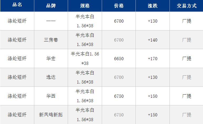 1.4D半光直紡滌綸短纖江浙商談重心6650-6750元/噸出廠或短送,福建主流商談6850-6900元/噸現款短送,山東、河北主流6750-6900元/噸送到。