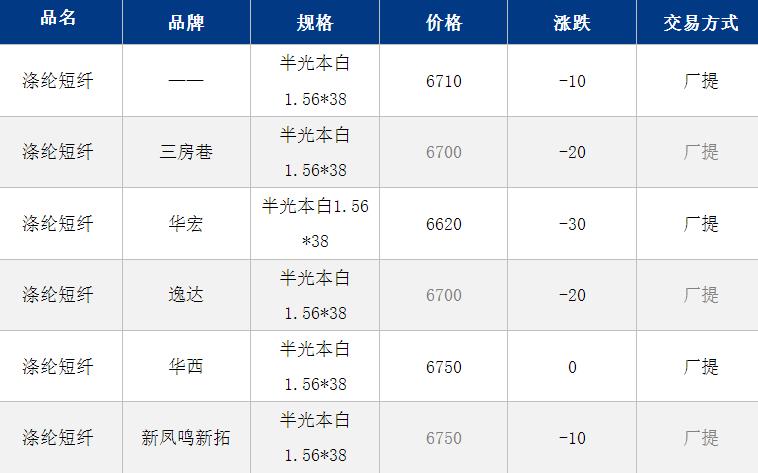 1.4D半光直紡滌綸短纖江浙商談重心6600-6800元/噸出廠(chǎng)或短送,福建某直紡滌綸短纖大廠(chǎng)報(bào)價(jià)維穩(wěn),1.4D半光報(bào)7000元/噸現(xiàn)款短送,成交按單商談,山東、河北主流6750-6900元/噸送到。