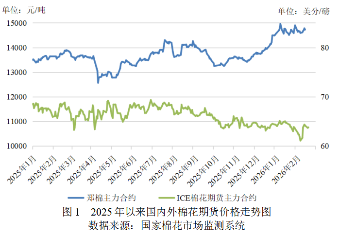 國內(nèi)市場方面,春節(jié)前市場交投趨于清淡,國內(nèi)棉價窄幅震蕩為主;春節(jié)期間國際市場釋放利多消息,節(jié)后避險資金重新回場,鄭棉價格增倉上行,國內(nèi)棉花現(xiàn)貨價格攀升。截至2月26日,鄭州商品交易所棉花期貨主力合約結算價15450元/噸,較上月末上漲550元/噸,漲幅3.69%;代表內(nèi)地標準級皮棉市場價格的國家棉花價格B指數(shù)16583元/噸,較上月末上漲526元/噸,漲幅3.28%。內(nèi)外價差由上月末的3603元/噸擴大至3844元/噸,持續(xù)刷新十年以來最高水平。