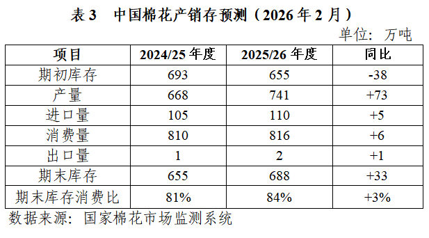 (二)供需形勢方面,本年度棉花銷售進度顯著快于往年,下年度棉花供應收緊預期較強。截至2026年2月26日,2025/26年度全國棉花銷售率69.5%,折合銷售量515萬噸,較去年同期增加185萬噸;全國棉花公檢完成748萬噸,同比增長14.3%。當前,外棉價格低于國內(nèi)棉價3800元/噸左右,紡織廠采購外棉意愿增強。國內(nèi)即將進入新年度生產(chǎn)備播關鍵期,受新疆植棉面積調減政策等因素影響,業(yè)內(nèi)對新年度國內(nèi)棉花供應趨緊形成共識,在此背景下,新一輪目標價格政策落地與種植落實情況成為市場焦點,將直接決定下年度國內(nèi)棉花供應縮減幅度。