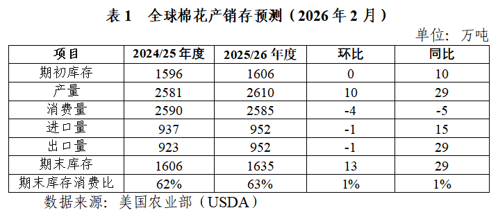 (二)供需形勢方面,本年度全球棉花供需平衡略寬松,下年度全球棉花供需形勢轉向產(chǎn)不足需。據(jù)美國農(nóng)業(yè)部2月預測,2025/26年度全球棉花產(chǎn)量調增10萬噸至2610萬噸,同比增長1.1%;消費量下調4萬噸至2585萬噸,同比下降0.2%;全球棉花產(chǎn)大于需25萬噸。近期,棉花主產(chǎn)國出口供應有所分化,澳棉、巴西棉出口延續(xù)增長,美棉出口裝運相對偏弱。截至2025年12月末,本年度澳棉出口78.1萬噸,同比加快13.9%,出口進度65.2%。截至2026年1月末,巴西棉出口172.2萬噸,同比加快5.6%,出口進度54.5%;美棉出口裝運91.3萬噸,同比下降2.6%,出口進度28.9%。