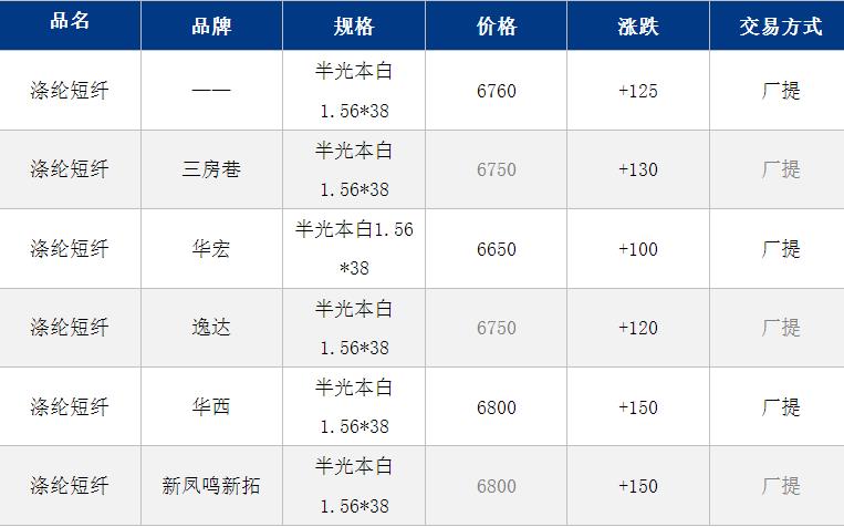 1.4D半光直紡滌綸短纖江浙商談重心6650-6900元/噸出廠或短送,福建主流商談7000-7100元/噸現(xiàn)款短送,山東、河北主流6800-7050元/噸送到。
