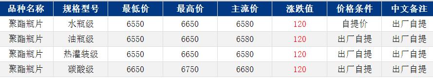 華東聚酯瓶片收于6580元/噸,漲跌值120元/噸,原油及原料繼續(xù)上行,成本推動(dòng)下,聚酯瓶片工廠報(bào)價(jià)多上調(diào)100元/噸,重心明顯上行。場(chǎng)內(nèi)低價(jià)貨源消失,且出貨價(jià)格變動(dòng)較快,3月貨源商談6550-6650元/噸,遞盤6540-6570元/噸,或期貨合約2605+80。