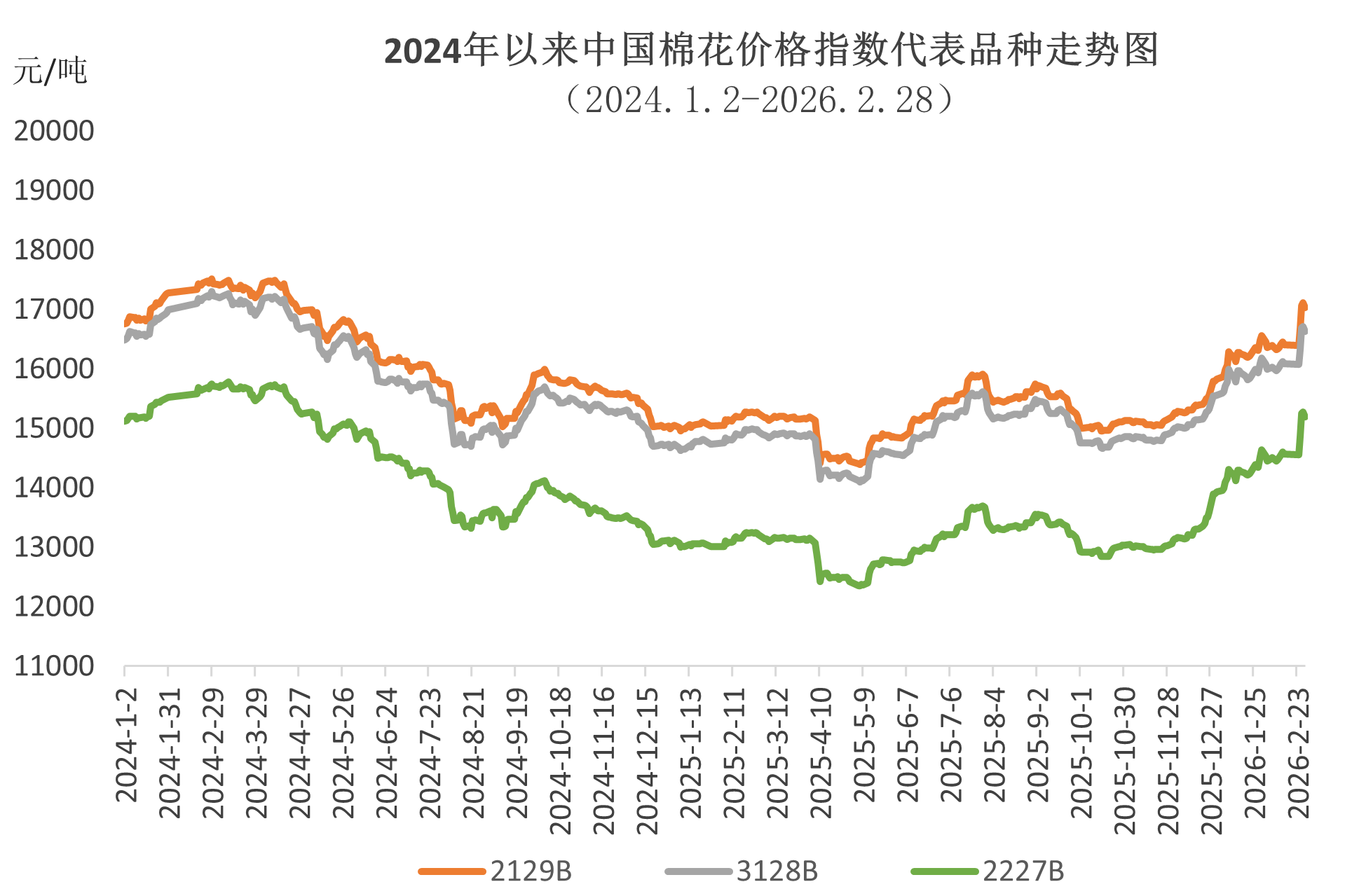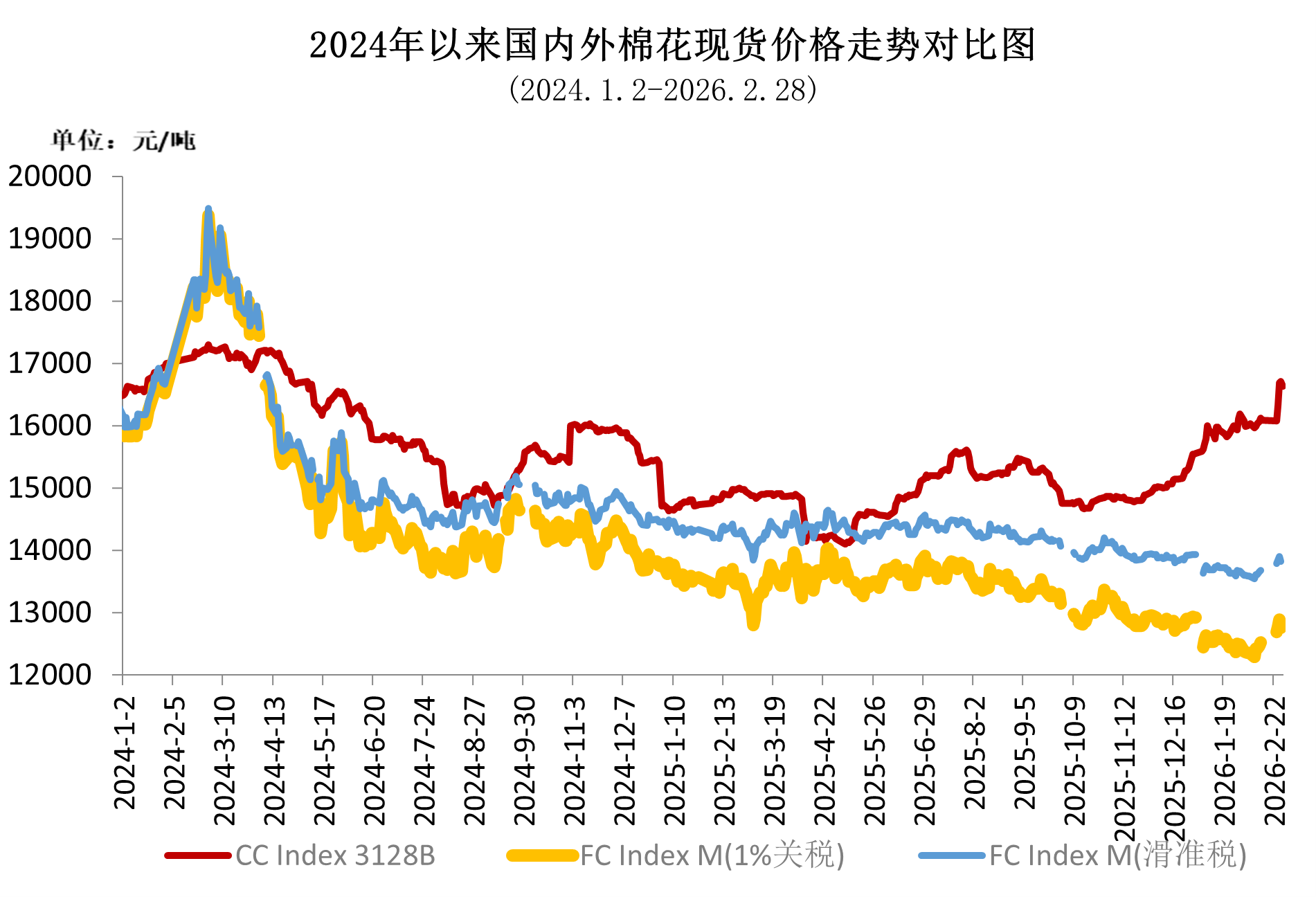 2月國內(nèi)外棉價均呈上行走勢。國內(nèi)棉價節(jié)前受春節(jié)假期影響小幅波動,節(jié)后在紡織廠復(fù)工復(fù)產(chǎn)、外盤上漲的推動下強(qiáng)勢回升;國際市場先抑后揚(yáng),前期受地緣沖突拖累走弱,中下旬因產(chǎn)需收緊預(yù)期、美國關(guān)稅政策變化等因素實現(xiàn)反彈,但漲幅不及國內(nèi),內(nèi)外棉價差持續(xù)擴(kuò)大。