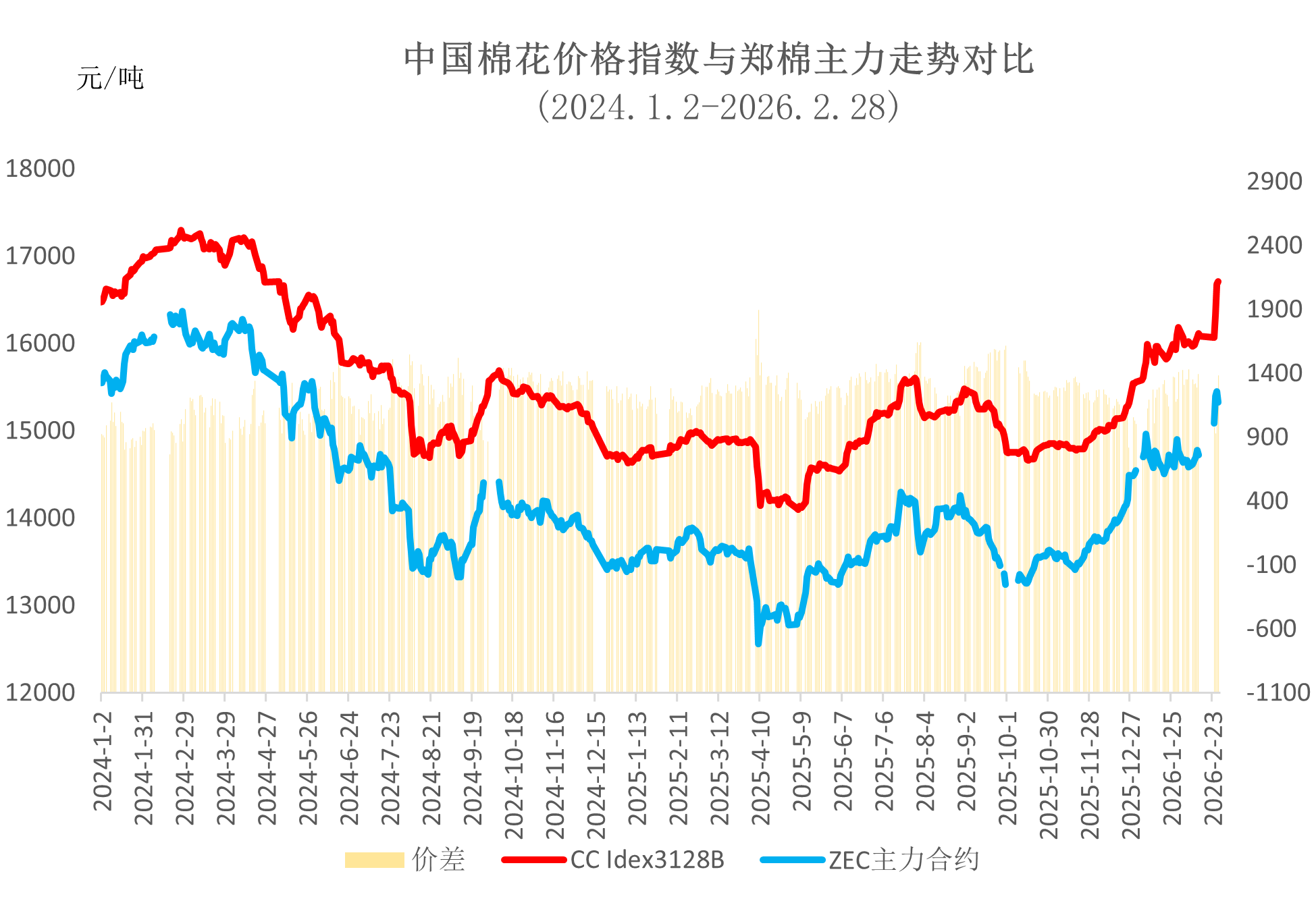 2月鄭棉呈震蕩走穩(wěn)、月末大幅攀升的走勢,全月重心顯著上移。月初受春節(jié)假期影響震蕩偏弱,下旬中東局勢緊張引發(fā)地緣風(fēng)險,疊加國內(nèi)穩(wěn)增長政策托底、消費回暖預(yù)期增強(qiáng),資金涌入推動期價快速沖高。鄭棉主力月內(nèi)最低14500元/噸,最高15665元/噸,最大漲幅8%。月末鄭棉主力結(jié)算價15260元/噸,低于同期中國棉花價格指數(shù)1383元/噸,兩者價差環(huán)比縮小30元/噸。鄭棉主力合約月均結(jié)算價14856元/噸,環(huán)比上漲152元,同比上漲1115元。