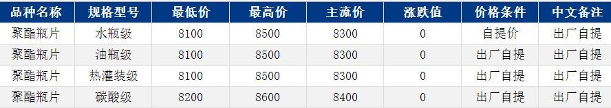 華東聚酯瓶片收于8300元/噸,漲跌值0元/噸,原料存一定支撐,聚酯瓶片工廠多報(bào)穩(wěn),重心僵持整理。3-4月貨源報(bào)盤8100-8500元/噸,局部略低8050元/噸附近。零星實(shí)單遞盤8050元/噸,業(yè)內(nèi)觀望情緒濃厚。