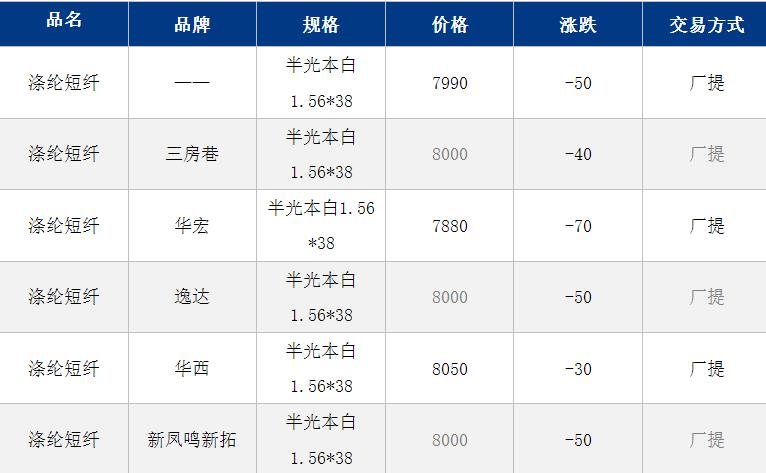 江蘇滌綸短纖現(xiàn)貨估價(jià)下跌50元到7990元/噸;早間短纖現(xiàn)貨商談參考7930-8050元/噸,偏低7850元/噸附近。