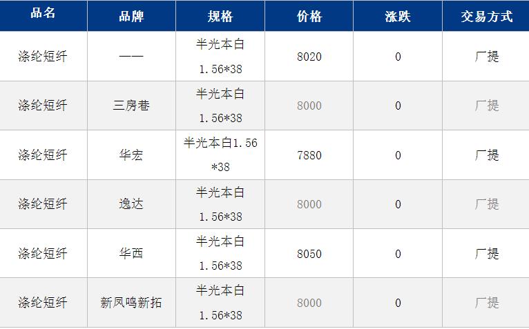 江蘇滌綸短纖現(xiàn)貨估價暫穩(wěn)至8020元/噸;早間短纖現(xiàn)貨商談參考7950-8050元/噸,偏低7900元/噸附近。