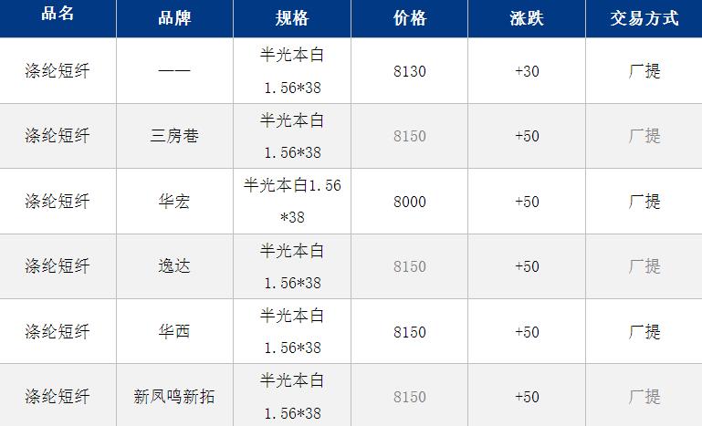 1.4D半光直紡滌綸短纖江浙商談重心8050-8400元/噸出廠或短送,福建主流商談8100-8350元/噸現(xiàn)款短送,山東、河北主流8200-8550元/噸送到。