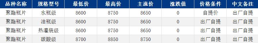 華東聚酯瓶片收于8650元/噸,漲跌值0元/噸,原油上漲,然而原料拖累,聚酯瓶片高位震蕩,4月貨源報盤8600-8750元/噸,部分略低8450-8500元/噸,零星遞盤8600元/噸附近,暫無實單商談。美伊關(guān)系反復(fù)化,業(yè)內(nèi)觀望情緒濃厚。