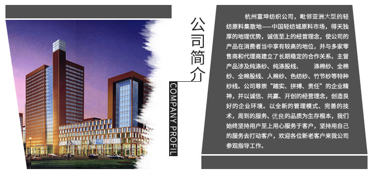 杭州富坤紡織有限公司,毗鄰亞洲大型的輕紡原料集散地-中國輕紡城原料市場,得天獨厚的地理優(yōu)勢,誠信至上的經(jīng)營理念,使公司的產(chǎn)品在消費者當中享有較高的地位,并與多家零售商和代理商建立了長期穩(wěn)定的合作關(guān)系。主營產(chǎn)品涉及純滌紗、純滌股線、滌棉紗、全棉紗、全棉股線、人棉紗、色紡紗、竹節(jié)紗等各種特種紗線。公司尊崇“踏實、拼搏、責任”的企業(yè)精神,并以誠信、共贏、開創(chuàng)的經(jīng)營理念,創(chuàng)造良好的企業(yè)環(huán)境。以全新的管理模式、完善的管理技術(shù),周到的服務(wù)、優(yōu)良的品質(zhì)為生存根本,我們始終堅持用戶至上用心服務(wù)于客戶,堅持用自己的服務(wù)去打動客戶,歡迎各位新老客戶來我公司參觀指導(dǎo)工作。