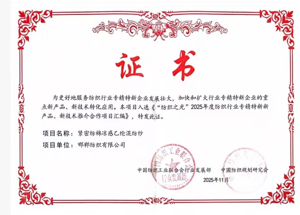 邯鄲紡織有限公司作為邯鄲市紡織行業(yè)協(xié)會(huì)會(huì)長(zhǎng)單位和行業(yè)龍頭企業(yè),擁有國(guó)內(nèi)外先進(jìn)水平的紡紗(8萬(wàn)錠細(xì)紗機(jī))和織造(238臺(tái)進(jìn)口噴氣布機(jī))設(shè)備,產(chǎn)品以高支精梳紗、股線類(lèi)、新纖維混紡高支、麻灰紗、麻彩紗、高支高密坯布、高端制服類(lèi)坯布,包漂白類(lèi)坯布、紗線。現(xiàn)有在崗員工1000余人,專(zhuān)業(yè)技術(shù)人員160人。