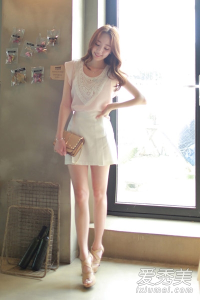 粉色雪紡上衣加入白色蕾絲裝飾,甜美清新,淑女范兒,搭配白色A字裙清純可人,配高跟涼鞋顯得更加高挑苗條。