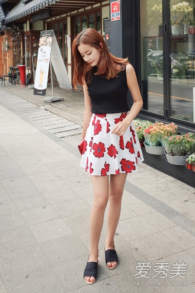 黑色無袖上衣修身款式,襯托曲線美,完全是顯瘦的利器,搭配精美的印花A字裙,白底紅花靚麗不失清新感,穿出明艷大氣的感覺。
