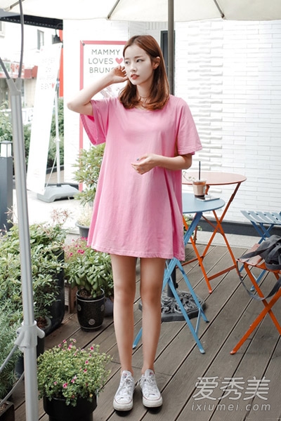 玫粉色連衣裙甜美可人,寬松版型,休閑又可愛,非常減齡,尤其是搭配一雙白色帆布鞋,完全就是十八歲的清純女學(xué)生模樣。