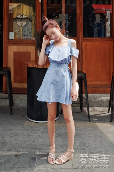 淺藍色連衣裙,時尚性感的露肩設(shè)計,秀出美麗的香肩好迷人,胸前荷葉邊裝飾,精致又甜美,收腰款式,A字裙擺,都是比較顯瘦的設(shè)計,穿出清新與活潑,很有少女感。