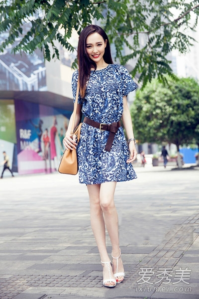 藍(lán)色印花連衣裙,浪漫的印花洋溢著濃濃夏日風(fēng)情,猶如海風(fēng)吹面般清爽,腰帶隨意一系,更具時尚感,也劃分出修長比例。