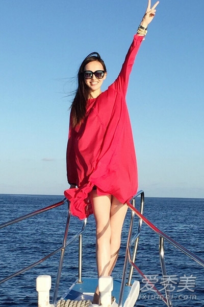 唐嫣出海裝扮,身穿紅色長款上衣配短褲,秀出白皙美腿很誘人,紅色顯得明艷大方,極具活力。