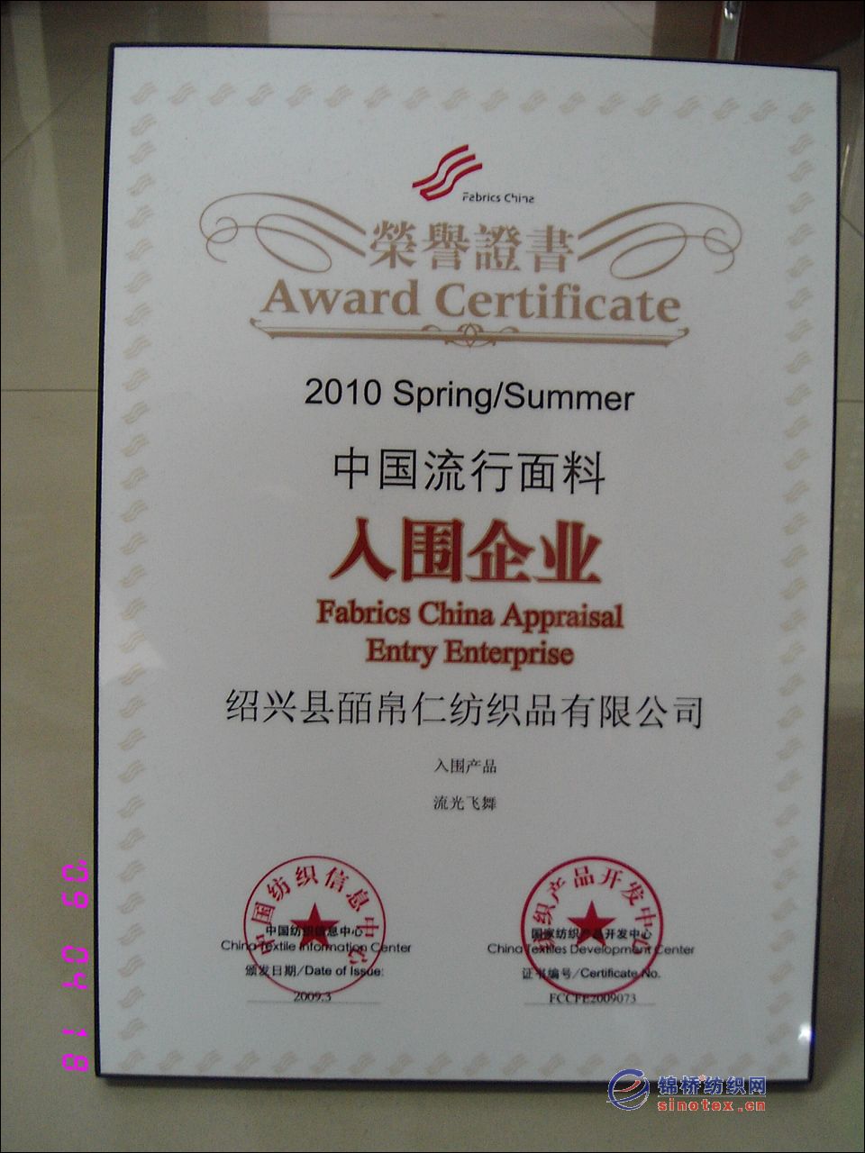 流行面料入選證書(shū)09